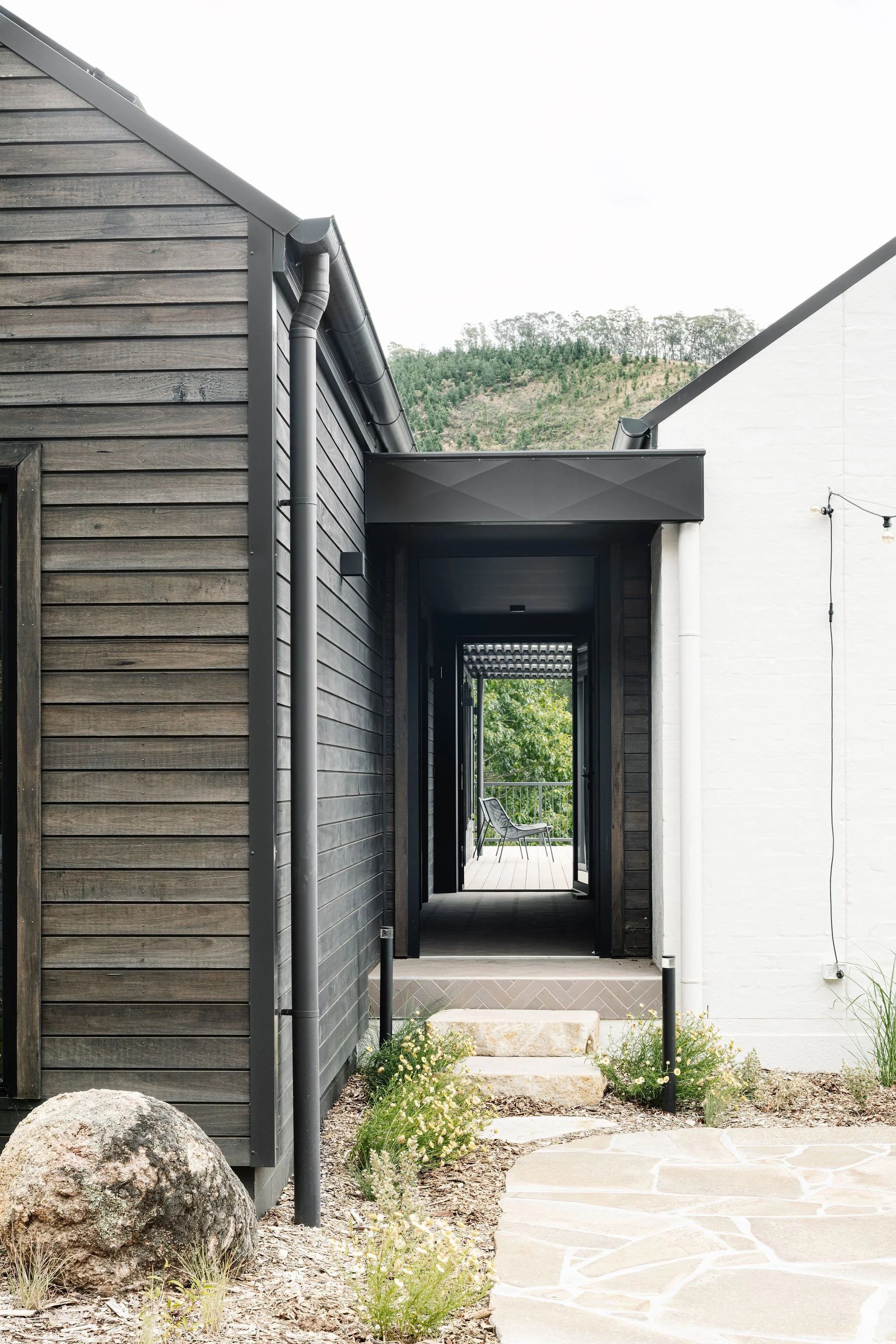 Timber cladding: Locally sourced bushfire resistant timber sourced from 100% plantation timber grown on ex-farm land. Radial sawing maximises the recovery of sawn timber from smaller logs.
